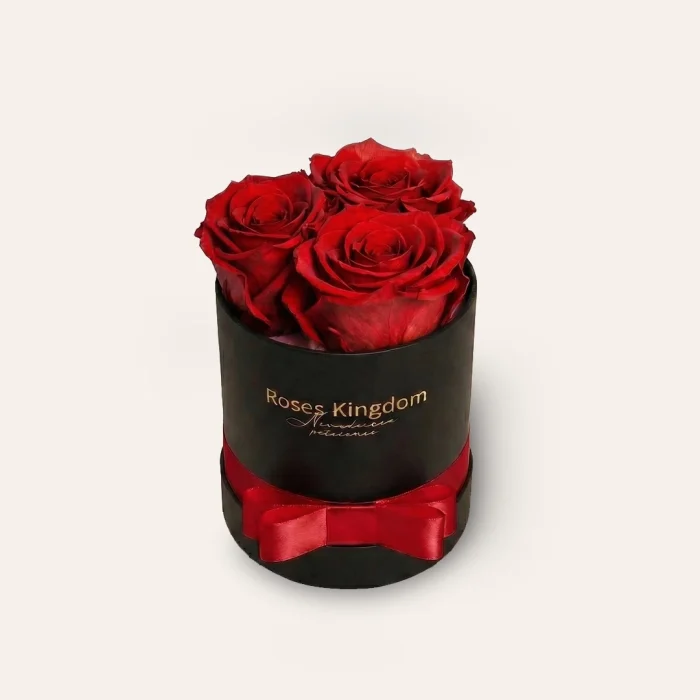 Průměr boxu je 8,5 cm a výška 9 cm. V boxu jsou 3 růže o průměru 5-6 cm. Žive stabilizovaná růže s výdrží 1-3 roky. Koženkový potah s luxusním logem ve zlaté barvě a doladěnou mašlí podle barvy květů. Vytvoříme pro Vás věnování podle Vašich představ.