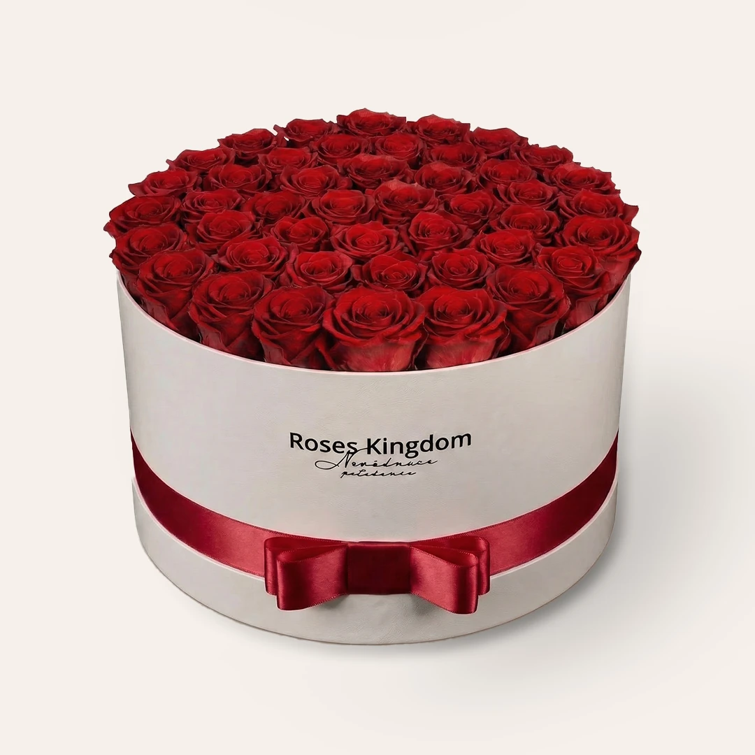 Box z růží DELUXE je pečlivě ručně vyrobený v ČR. K výrobě jednoho boxu používáme jen ty nejkvalitnější hlavičky růží. Růže jsou vkládány a připevňovány do elegantního boxu o průměru 30 cm a výšce 17 cm. Na jeden box používáme 41-51 hlaviček růží. Počet růží v boxu se liší od velikosti jejich hlaviček. Obvykle se v boxu nachází rovných 50 růží. Přejete si box s požadovaným počtem? Neváhejte nás kontaktovat a my Vašemu požadavku vyhovíme. Ve skutečnosti tento box vypadá ještě větší a růže jsou uvnitř DOKONALÉ. Tímto darem zaručeně zapůsobíte a prožijete krásnou chvíli s milovanou osobou.