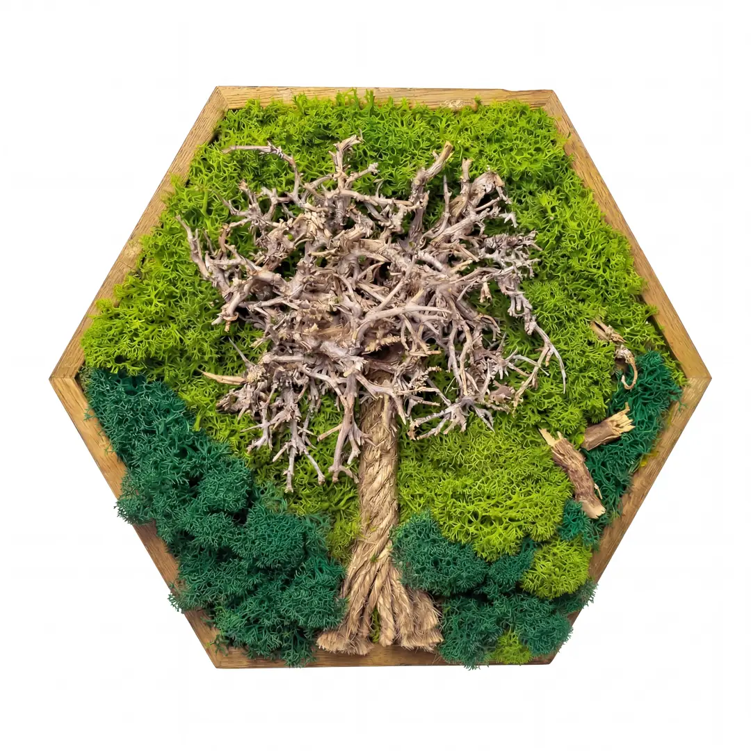 Každý Mechový obraz – Stromeček života je precizní, poctivá ruční výroba. Neexistují dva naprosto identické kusy, každý obraz je originál s jedinečným uspořádáním mechu. Základem tohoto díla je kvalitní šestihranný dřevěný rám o průměru 20 cm, který pevně drží stabilizovaný mech.